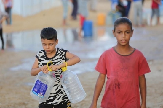 9月26日,在加沙地帶中部城市代爾拜拉赫,當(dāng)?shù)孛癖娬谶\(yùn)水。新華社發(fā)(馬爾萬(wàn)·達(dá)烏德攝)