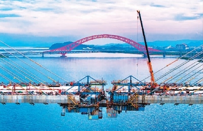 近日,浙江寧波舟山港六橫公路大橋一期項目梅山水道橋即將合龍。該大橋建成后,可實現(xiàn)六橫島、佛渡島、梅山島三島港區(qū)、產(chǎn)業(yè)聯(lián)動發(fā)展,推動甬舟一體化駛?cè)搿翱旌降馈?。胡學(xué)軍攝(人民視覺)