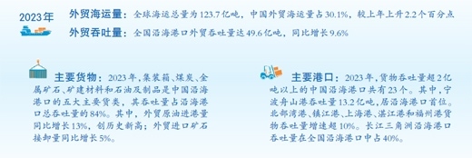 在全球范圍內(nèi),超八成的國際貿(mào)易通過海上運輸實現(xiàn),海運是中國外貿(mào)的“大動脈”。《中國港口運行分析報告(2024)》(以下簡稱《報告》)顯示,2023年,在外貿(mào)需求回暖、全球貿(mào)易體系重塑等因素推動下,中國外貿(mào)海運規(guī)模增長較快,全國沿海港口外貿(mào)吞吐量達(dá)49.6億噸,同比增長9.6%。