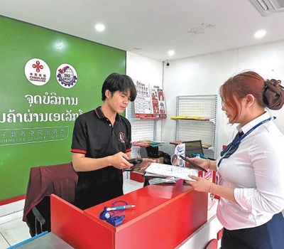在老撾首都萬象市一處便民服務(wù)點(diǎn),當(dāng)?shù)鼐用袷杖≡陔娚唐脚_(tái)選購的商品快遞。本報(bào)記者 孫廣勇攝
