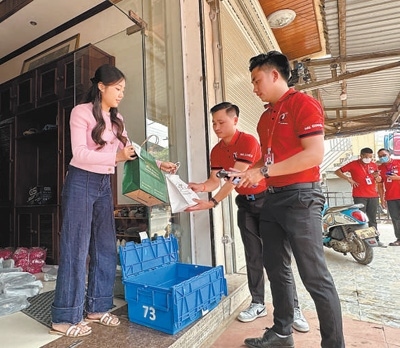 中國援老撾農(nóng)村電子商務(wù)平臺(tái)對(duì)接的物流公司將商品送到老撾北部烏多姆賽省孟賽縣居民手中。本報(bào)記者 孫廣勇攝