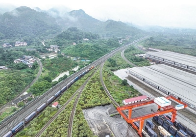 6月27日,西部陸海新通道中老泰馬跨境鐵路班列在重慶江津小南埡站發(fā)車(無人機(jī)照片)。該班列的開行將促進(jìn)通道沿線地區(qū)與東盟國家的經(jīng)貿(mào)合作和產(chǎn)業(yè)聯(lián)動(dòng)。新華社記者 唐 奕攝