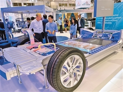 在慕尼黑國際車展上,工作人員向歐洲客戶介紹寧德時(shí)代的電池技術(shù)。本報(bào)記者 李 強(qiáng)攝