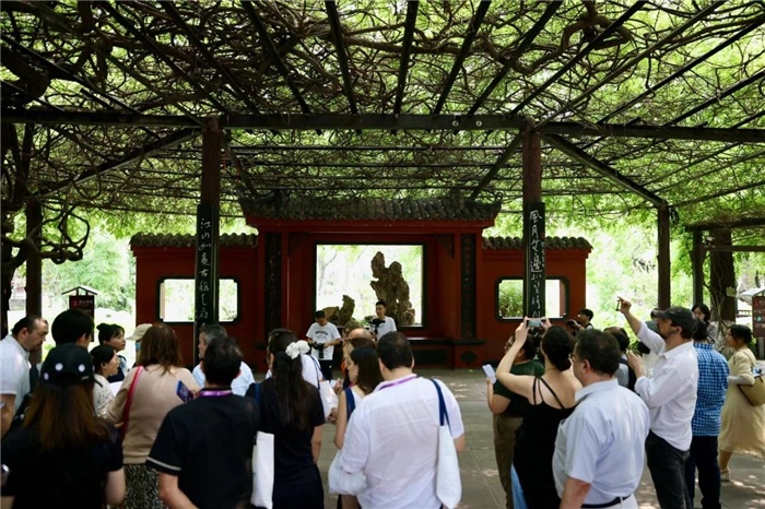 桂湖公園內(nèi)最著名的古建筑之一是楊升庵祠堂。楊慎,號(hào)升庵,是從新都走出的明代四川唯一狀元,他剛正立朝、嚴(yán)謹(jǐn)治學(xué),被稱為明代三大才子之首,“滾滾長(zhǎng)江東逝水,浪花淘盡英雄”便出自他的筆下。公園工作人員向考察團(tuán)介紹,桂湖原是楊升庵的書(shū)苑,在這里,他沿湖植歸,摘種荷花,培植風(fēng)景。作為“四川首批十大歷史名人”之一,楊升庵“為國(guó)為民,一片丹心”的家國(guó)情懷和“好學(xué)窮理,精思深索”的治學(xué)精神已成為新都人文精神的象征。