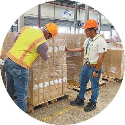 “海運+海外倉”是中遠海運探索出的“一站式”全程綜合物流服務模式,集海運、倉儲、報關等服務于一體。圖為在巴拿馬科隆自由貿(mào)易區(qū)內(nèi)的中遠海運海外倉,工作人員對抵達的貨物進行質檢??逅埂ぐ嗟夏釘z