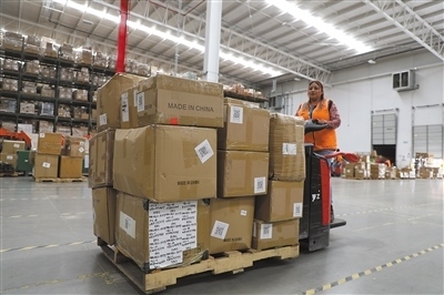 美獅集團墨西哥州海外倉內(nèi),一名員工從傳送帶取下貨物放到拖車上,準備移動至智能上架區(qū)入庫。本報墨西哥分社 埃內(nèi)斯托·多明戈斯攝