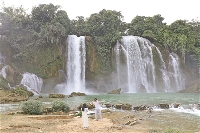 從越南首都河內(nèi)驅(qū)車往東北方向行駛400多公里,一路經(jīng)過星羅棋布的稻田,越過連綿不絕的原始叢林和崇山峻嶺,最終抵達(dá)高平省重慶縣潭水鄉(xiāng)歸春河畔,就能看到著名的中越德天(板約)跨國瀑布(見圖二,本報(bào)記者楊曄攝)。10月14日,中越德天(板約)瀑布跨境旅游合作區(qū)宣布正式投入運(yùn)營,成為中國首個(gè)跨境旅游合作區(qū)。近日,本報(bào)記者到此進(jìn)行了實(shí)地探訪。