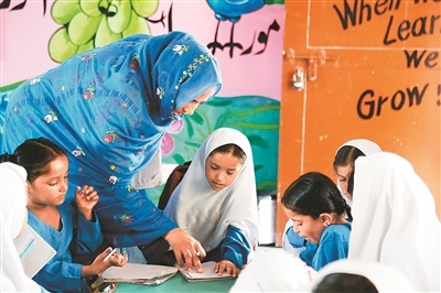 走進(jìn)干凈整潔的校園,讀書聲、嬉戲聲聲聲入耳,孩童的活力、青春氣息撲面而來。在八年級的課室里,戴著一條寫有“文學(xué)比賽冠軍”紅綬帶的女學(xué)生薩伊巴·阿斯加爾·阿里成功搶到了回答問題的機(jī)會(huì),正在大聲地在全班面前朗誦英語課文。薩伊巴告訴記者,她有7個(gè)姐妹,如果沒有這所學(xué)校,她可能就沒學(xué)上了。