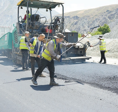 在中塔公路二期建設(shè)項(xiàng)目施工現(xiàn)場,工作人員正在鋪設(shè)瀝青。