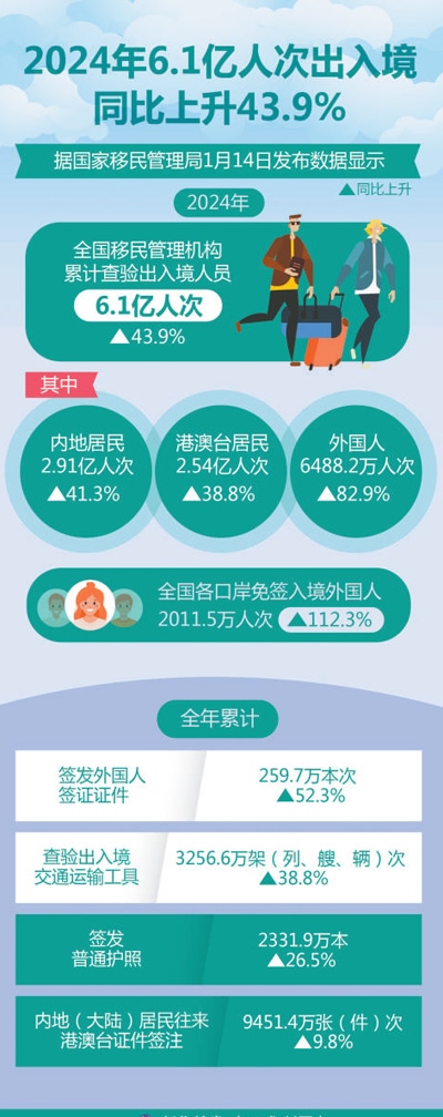 在2024年中國國際傳播年度熱詞榜上,“中國游”一詞名列前十。中國全面放寬優(yōu)化免簽政策,推出一系列便利外國人來華政策舉措,“中國游”成為越來越多外國游客的優(yōu)先選擇。中國國家移民管理局最新數(shù)據(jù)顯示,2024年,全國移民管理機(jī)構(gòu)累計(jì)查驗(yàn)出入境人員6.1億人次,同比上升43.9%;其中內(nèi)地居民2.91億人次、港澳臺(tái)居民2.54億人次、外國人6488.2萬人次,同比分別上升41.3%、38.8%、82.9%。全國各口岸免簽入境外國人2011.5萬人次,同比上升112.3%。說走就走的“中國游”打開了世界了解中國的新窗口、新通道,向全球展現(xiàn)真實(shí)、多元和活力滿滿的中國形象。
