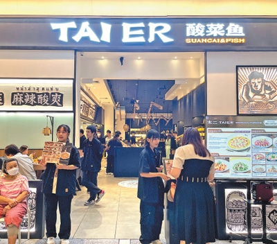 黑白色調(diào)的裝飾,開放式廚房,可愛(ài)的公仔,有趣的掛畫……太二酸菜魚在泰國(guó)的第一家店開在曼谷最繁華的一家商場(chǎng),店內(nèi)的裝修風(fēng)格十分別致。記者在店員熱情的口號(hào)聲中被迎進(jìn)店里。正值晚餐高峰期,店內(nèi)座無(wú)虛席,還有人在排隊(duì)等座(見(jiàn)圖①,本報(bào)記者劉慧攝)?;旧厦孔蓝紩?huì)點(diǎn)一道酸菜魚。雪白的魚片被盛在一個(gè)大盤子里,配上爽脆的酸菜、金黃的菊花瓣、紅色的辣椒,酸香麻辣,令人食指大動(dòng)。