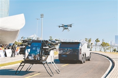 1月21日,海南飛行汽車應(yīng)用示范島項目在海南??趩?,小鵬匯天展示全球首款可在汽車上自動分離結(jié)合的電動純直起降飛行器。蘇弼坤攝(人民圖片)