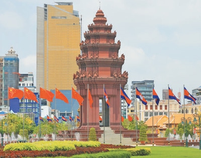 4月16日,在柬埔寨首都金邊市中心的獨(dú)立紀(jì)念碑前,中柬兩國國旗迎風(fēng)飄揚(yáng)。