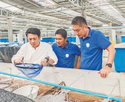 在柬埔寨干丹省一處羅氏沼蝦育苗場,上海海洋大學(xué)柬埔寨稻漁項(xiàng)目組成員指導(dǎo)當(dāng)?shù)毓ぷ魅藛T進(jìn)行苗種培育。