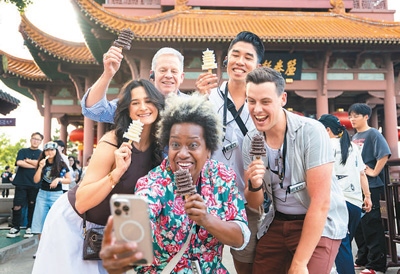 外國(guó)游客在湖北武漢黃鶴樓前手持文創(chuàng)雪糕拍照。