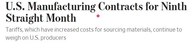 《華爾街日報》1日發(fā)表文章稱,美國供應管理協(xié)會(ISM)當天公布的調查報告顯示,11月美國制造業(yè)采購經(jīng)理人指數(shù)(PMI)已低于50的榮枯分界線。美國制造業(yè)活動連續(xù)第九個月萎縮,而美國制造商認為這主要是因為美國政府的關稅政策。