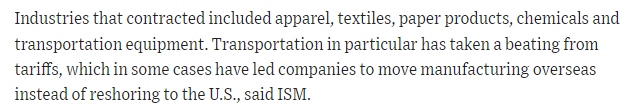 文章指出,美國制造業(yè)活動萎縮的行業(yè)主要包括服裝、紡織品、紙制品、化工產品和運輸業(yè)。文章表示,雖然當前美國工廠產量有所增加,但未售出的庫存卻急劇增加。需求增長放緩,這在出口市場體現(xiàn)尤為明顯,而受關稅影響,出口市場的前景更加暗淡。