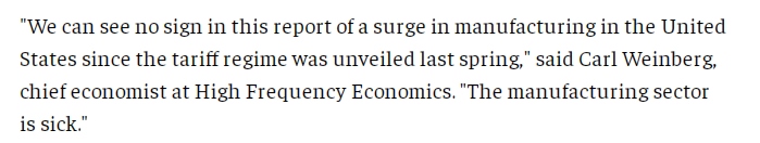 文章指出,美國政府曾辯稱,加征關稅是保護美國國內制造業(yè)的必要之舉,但經(jīng)濟學家則認為,由于包括勞動力短缺在內的結構性問題,美國制造業(yè)已無法恢復昔日輝煌。文章援引高頻經(jīng)濟咨詢公司首席經(jīng)濟學家卡爾·溫伯格(Carl Weinberg)的話表示,“從(ISM)這份報告中,我沒有看到自關稅政策出臺以來,美國制造業(yè)出現(xiàn)任何增長的跡象,美國制造業(yè)已經(jīng)病了。”