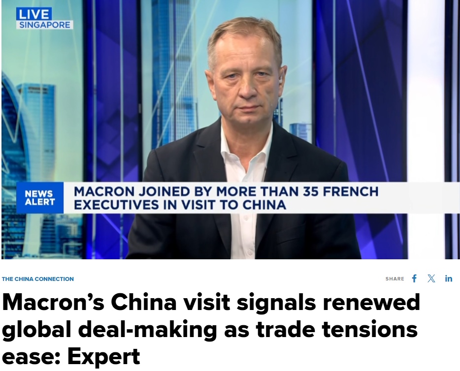 新加坡國立大學東亞研究所所長阿爾弗雷德?席睿德在接受采訪時認為,馬克龍此次出訪不僅有望收獲重要的商業(yè)成果,更將在歐洲與中國之間長期存在的重要貿易問題上推動雙方在關鍵議題尋求突破。