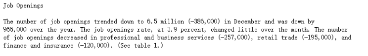 報(bào)道稱,因?yàn)檎[而推遲發(fā)布的職位空缺和勞動(dòng)力流動(dòng)報(bào)告顯示出,在經(jīng)歷了數(shù)月的“微小變化”之后,美國(guó)12月份的職位空缺數(shù)量大幅下降,表明對(duì)新員工的需求有所減少。報(bào)道還指出,上周美國(guó)申請(qǐng)失業(yè)救濟(jì)金的人數(shù)創(chuàng)下兩個(gè)月來(lái)的最大增幅。美國(guó)勞工部發(fā)布的數(shù)據(jù)顯示,截至1月31日的一周,美國(guó)首次申請(qǐng)失業(yè)救濟(jì)金的人數(shù)為23.1萬(wàn)人,和前一周的人數(shù)相比增加了22000人。