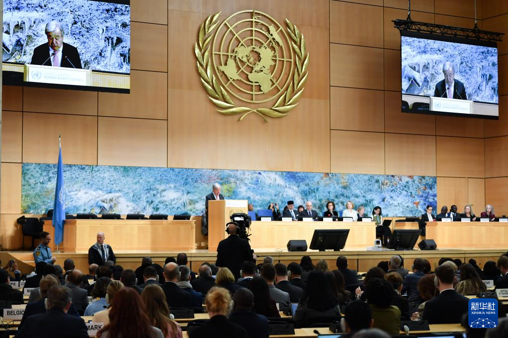 2月23日,在瑞士日內(nèi)瓦萬國宮,聯(lián)合國秘書長古特雷斯在聯(lián)合國人權(quán)理事會第61屆會議上講話。 新華社記者 連漪 攝