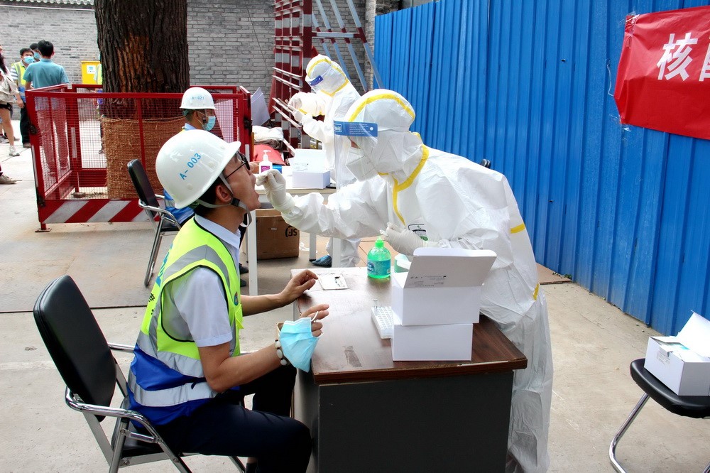 6月17日,在中建三局北京公司北京東城區(qū)一項(xiàng)目工地,工人接受核酸檢測(cè)。