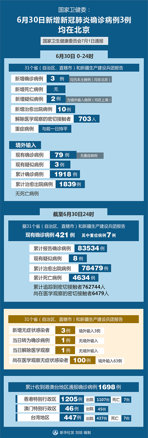 新華社北京7月1日電(記者胡喆)國家衛(wèi)生健康委員會7月1日通報,6月30日0-24時,31個省(自治區(qū)、直轄市)和新疆生產建設兵團報告新增確診病例3例,均為本土病例(均在北京);無新增死亡病例;新增疑似病例2例,為境外輸入病例(均在上海)。