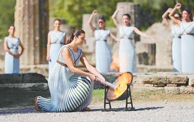 10月18日,北京冬奧會火種在希臘古奧林匹亞采集成功。圖為扮演最高女祭司的演員點燃火種。新華社記者 鄭煥松攝