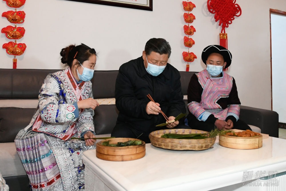 2021年2月3日至5日,習(xí)近平來到貴州考察調(diào)研,看望慰問各族干部群眾,向全國各族人民致以美好的新春祝福。這是3日下午,習(xí)近平在畢節(jié)市黔西縣新仁苗族鄉(xiāng)化屋村苗族村民趙玉學(xué)家,同趙玉學(xué)一家邊聊家常邊制作當?shù)貍鹘y(tǒng)節(jié)日食品黃粑。