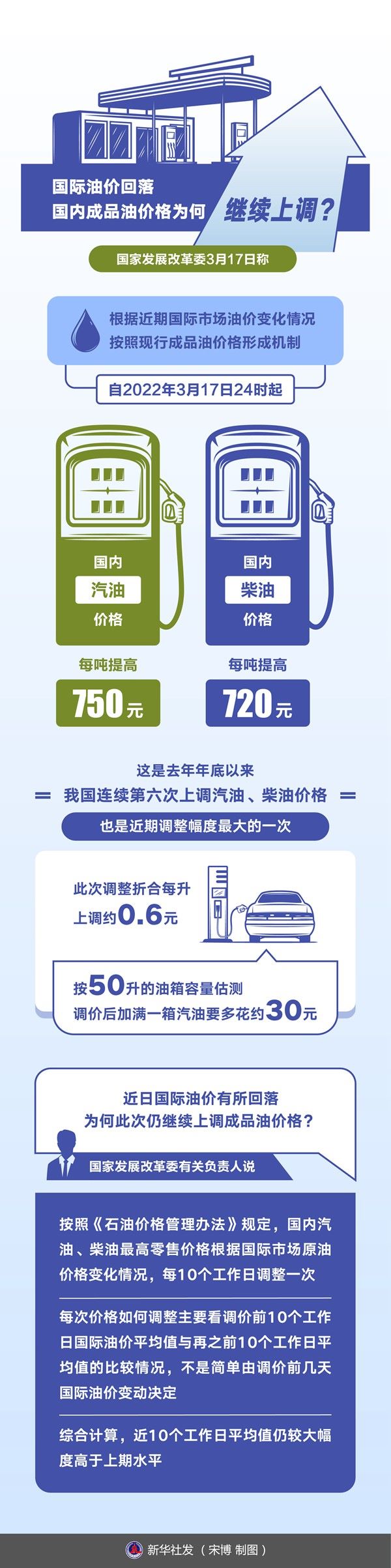 國家發(fā)展改革委17日稱,根據(jù)近期國際市場油價變化情況,按照現(xiàn)行成品油價格形成機制,自2022年3月17日24時起,國內(nèi)汽油、柴油價格每噸分別提高750元和720元。