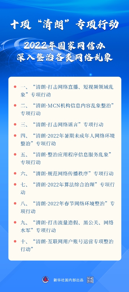新華社北京3月17日電(記者王思北)記者17日從國(guó)新辦舉行的新聞發(fā)布會(huì)獲悉,2022年“清朗”系列專項(xiàng)行動(dòng)將重點(diǎn)開(kāi)展打擊網(wǎng)絡(luò)謠言,打擊網(wǎng)絡(luò)直播、短視頻領(lǐng)域亂象,算法綜合治理,暑期未成年人網(wǎng)絡(luò)環(huán)境整治等十方面任務(wù)?! ?/p>