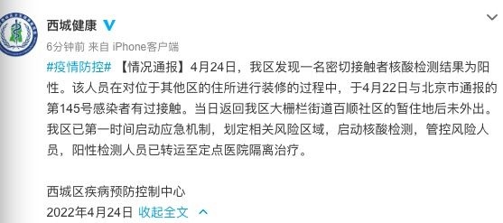 4月24日,我區(qū)(北京市西城區(qū))發(fā)現(xiàn)一名密切接觸者核酸檢測結(jié)果為陽性。該人員在對(duì)位于其他區(qū)的住所進(jìn)行裝修的過程中,于4月22日與北京市通報(bào)的第145號(hào)感染者有過接觸。當(dāng)日返回我區(qū)大柵欄街道百順社區(qū)的暫住地后未外出。
