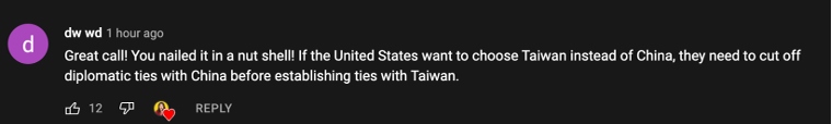 網(wǎng)友dw wd:“精彩的一期視頻!你簡潔而清晰地呈現(xiàn)了內(nèi)容,如果美國真的想選擇與臺灣建立所謂的‘外交關(guān)系’,他們首先需要與中國斷交。”