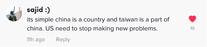 網(wǎng)友sajid:“真相很簡單,臺灣是中國的一部分,美國須停止給世界帶來新的麻煩?!?/p>