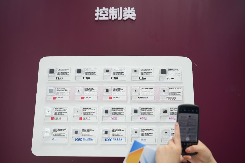 8月26日,一位參觀者在拍攝展出的車(chē)用芯片。當(dāng)日,2022世界新能源汽車(chē)大會(huì)在北京、海南兩地以線上、線下相結(jié)合的方式召開(kāi)。新華社記者鞠煥宗攝