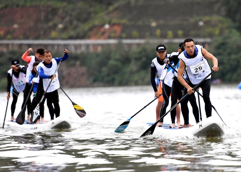 2018年11月18日,參賽選手在槳板團(tuán)體賽決賽中。當(dāng)日,2018年中國(guó)·將樂(lè)國(guó)際皮劃艇槳板馬拉松公開(kāi)賽在福建省將樂(lè)縣落幕。新華社記者彭張青攝