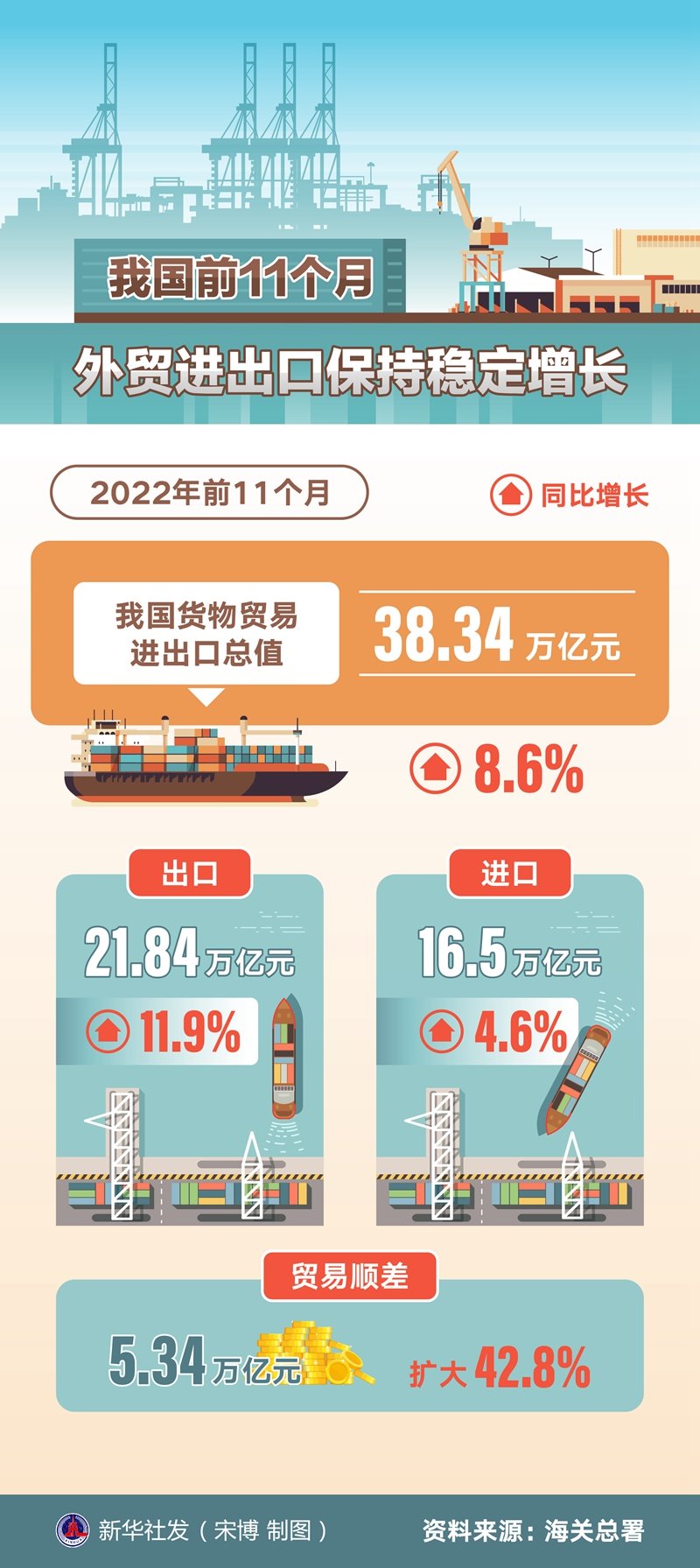 新華社北京12月7日電(記者鄒多為)海關(guān)總署7日發(fā)布數(shù)據(jù):今年前11個月,我國貨物貿(mào)易進出口總值38.34萬億元,同比增長8.6%。其中,出口21.84萬億元,增長11.9%;進口16.5萬億元,增長4.6%;貿(mào)易順差5.34萬億元,擴大42.8%。