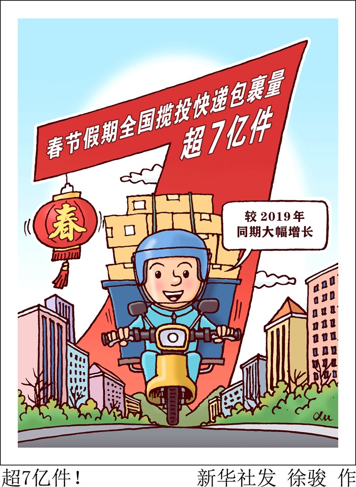 新華社北京1月28日電(記者戴小河)國家郵政局監(jiān)測數(shù)據(jù)顯示,1月21日至27日春節(jié)假期期間,全國郵政快遞業(yè)攬收快遞包裹約4.1億件,與去年春節(jié)假期相比增長5.1%,較2019年春節(jié)假期增長192.9%;投遞快遞包裹3.3億件,與去年春節(jié)假期相比增長10.0%,較2019年春節(jié)假期增長254.8%。