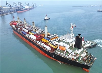 2月23日,中非班輪“塔內(nèi)斯夢(mèng)想”輪從山東港口煙臺(tái)港起航,前往坦桑尼亞達(dá)累斯薩拉姆港。 唐 克攝(人民圖片)