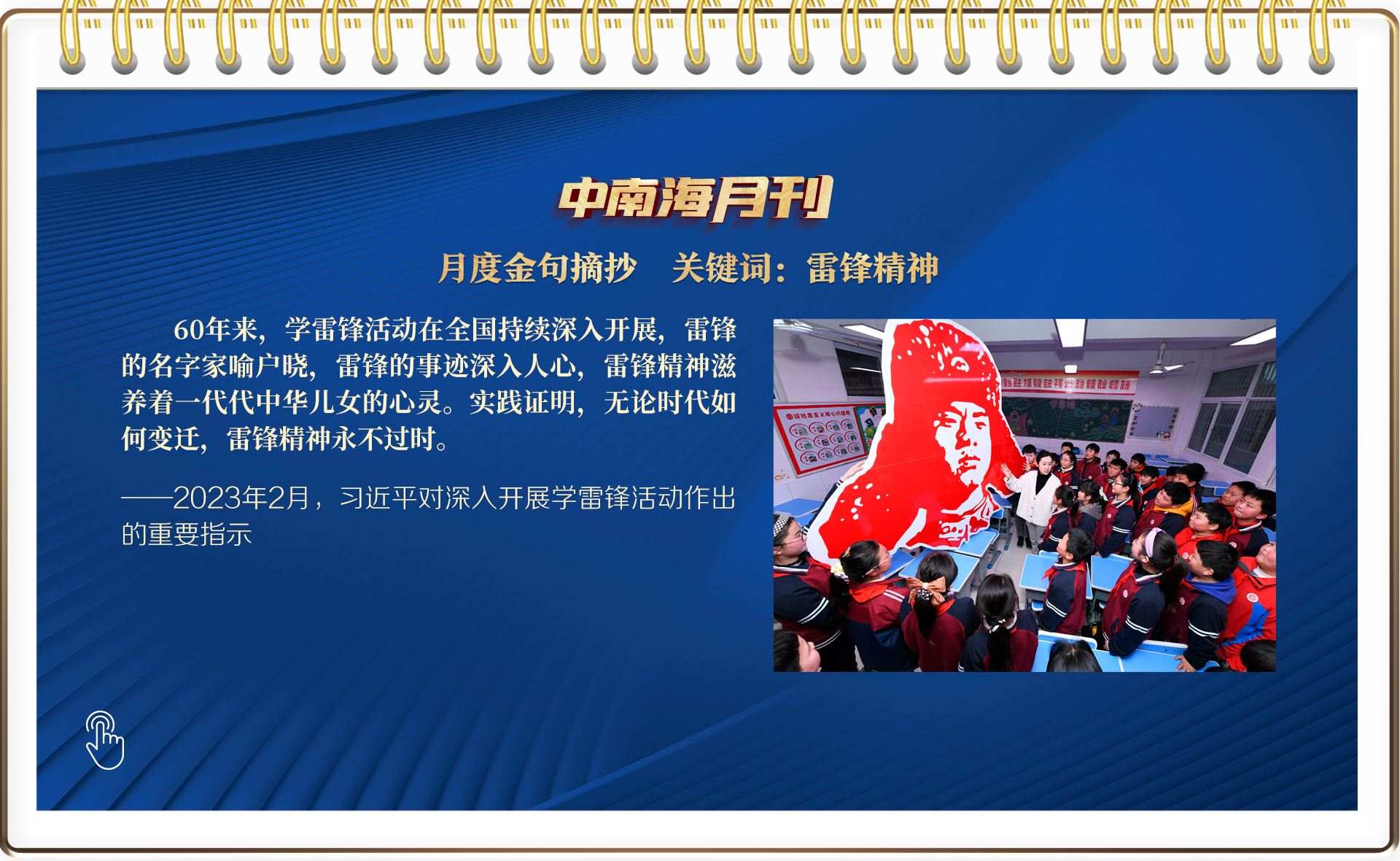 2月“關(guān)聯(lián)人物”中,雷鋒的名字家喻戶曉。在毛澤東等老一輩革命家為雷鋒同志題詞60周年之際,習(xí)近平總書(shū)記作出重要指示,一語(yǔ)道出了雷鋒精神的歷史厚度:“實(shí)踐證明,無(wú)論時(shí)代如何變遷,雷鋒精神永不過(guò)時(shí)?!?/p>
