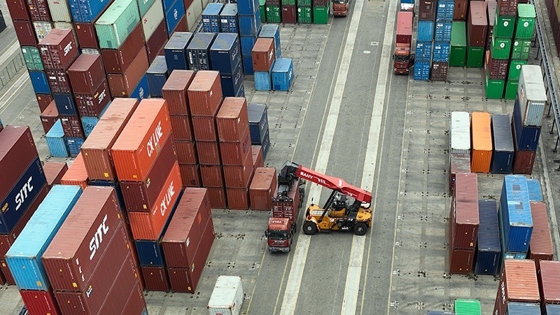 2023年2月15日,工人在廣西欽州港集裝箱碼頭駕駛裝卸車調(diào)運(yùn)集裝箱(無(wú)人機(jī)照片)。
