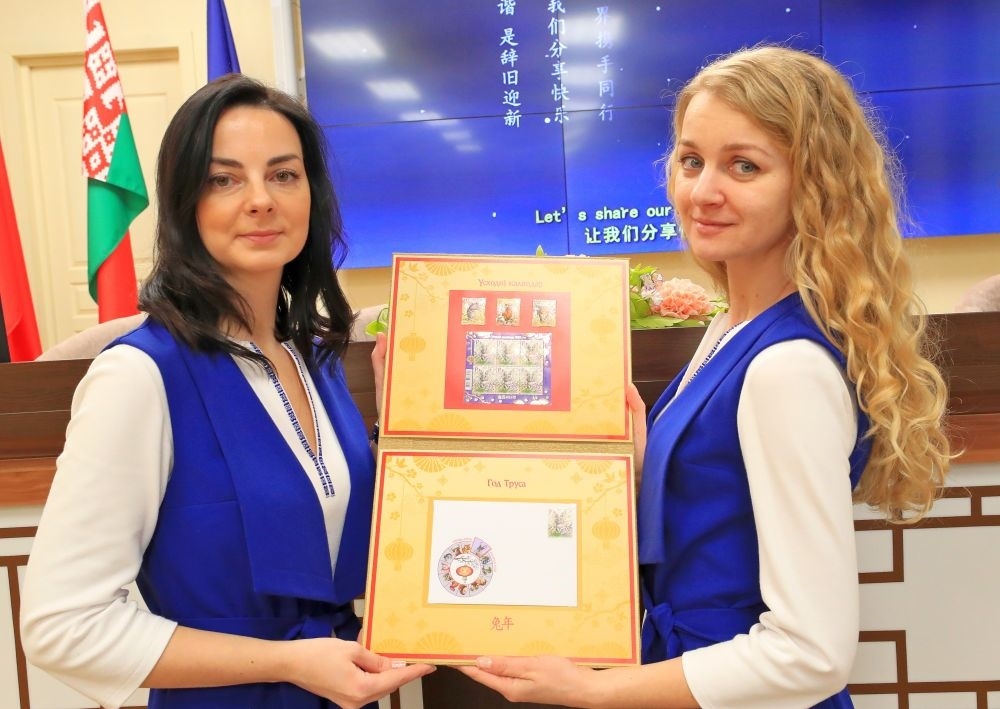 白俄羅斯國(guó)立大學(xué)孔子學(xué)院在明斯克舉辦《東方歷法:兔年》郵票和首日封發(fā)行儀式。工作人員展示白俄羅斯通信與信息化部發(fā)行的中國(guó)兔年郵票和首日封。
