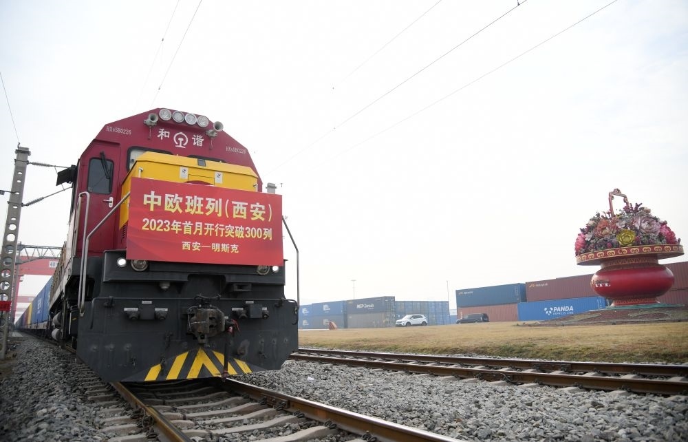 滿載日用百貨的X8151次中歐班列準(zhǔn)備從西安國(guó)際港站開(kāi)往白俄羅斯首都明斯克。