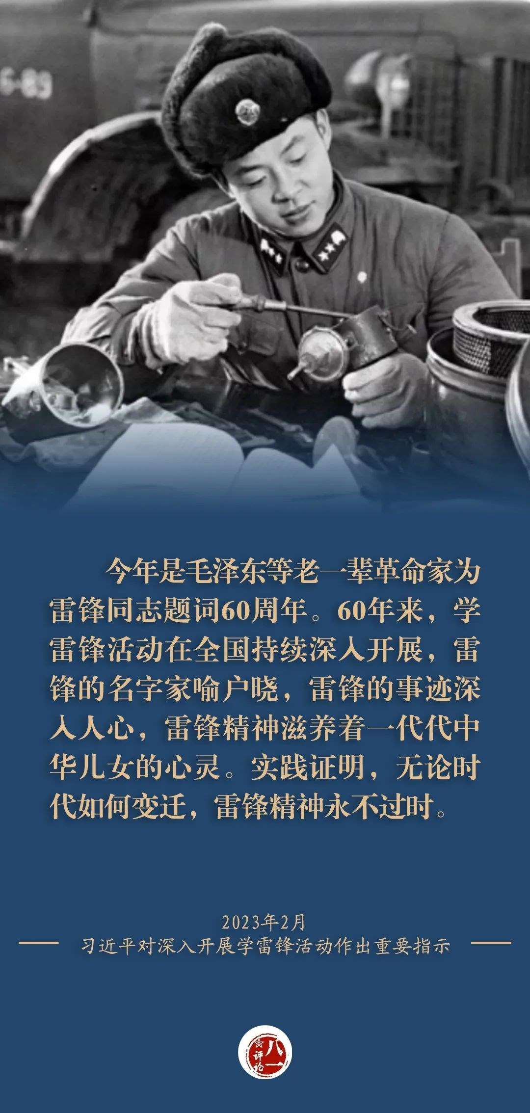 黨的十八大以來,習近平總書記對弘揚雷鋒精神作出一系列重要論述,深刻指出“雷鋒是時代的楷模,雷鋒精神是永恒的”“雷鋒精神,人人可學;奉獻愛心,處處可為”。