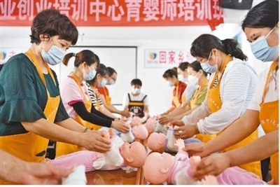 湖北省襄陽市保康縣就業(yè)創(chuàng)業(yè)培訓(xùn)中心,學(xué)員在育嬰師培訓(xùn)班上練習(xí)新生兒護理技能。楊 韜攝(影像中國)