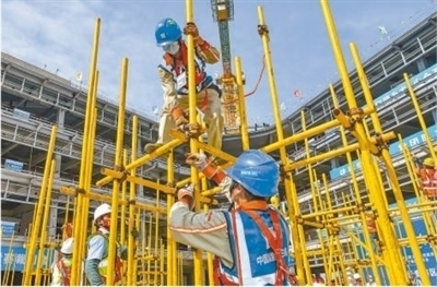 海南省建筑業(yè)職工職業(yè)技能競賽暨質(zhì)量安全現(xiàn)場觀摩交流會現(xiàn)場,建筑工人正在進行架體搭設(shè)競賽。康登淋攝(影像中國)
