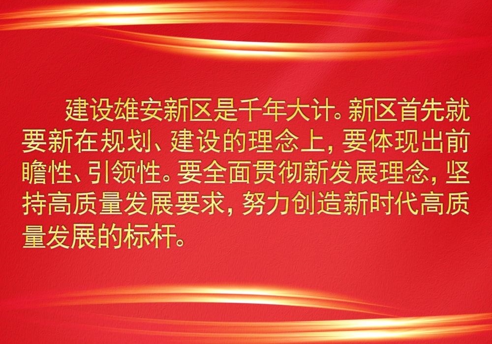 習(xí)近平總書(shū)記高瞻遠(yuǎn)矚謀劃推動(dòng)雄安新區(qū)規(guī)劃建設(shè),他強(qiáng)調(diào),要貫徹高質(zhì)量發(fā)展要求,創(chuàng)造“雄安質(zhì)量”,在推動(dòng)高質(zhì)量發(fā)展方面成為全國(guó)的一個(gè)樣板。