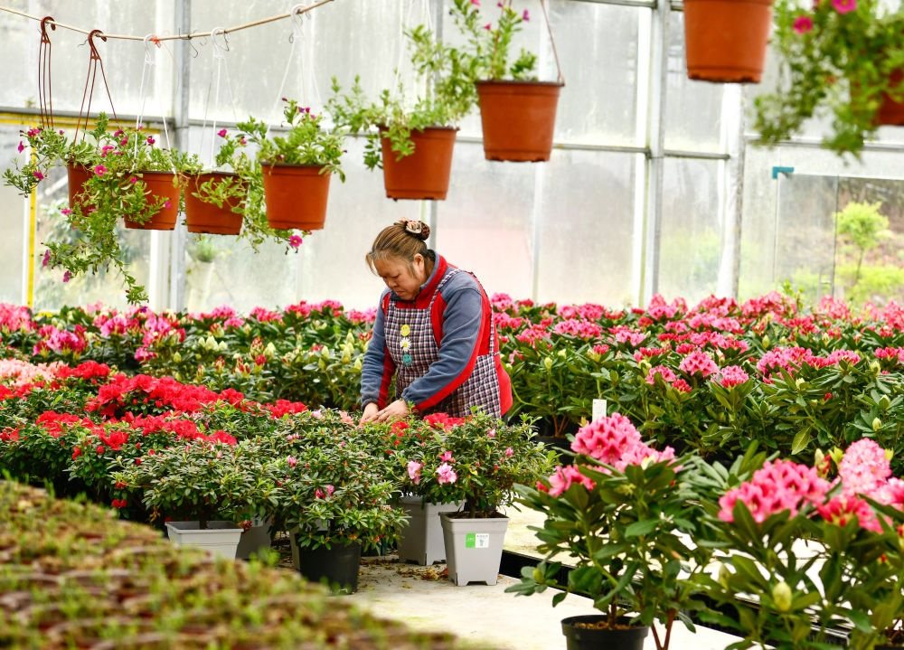 農(nóng)民在貴州省畢節(jié)市百里杜鵑管理區(qū)匯境花卉基地管護(hù)花卉(2023年3月28日攝)。新華社記者 楊文斌 攝