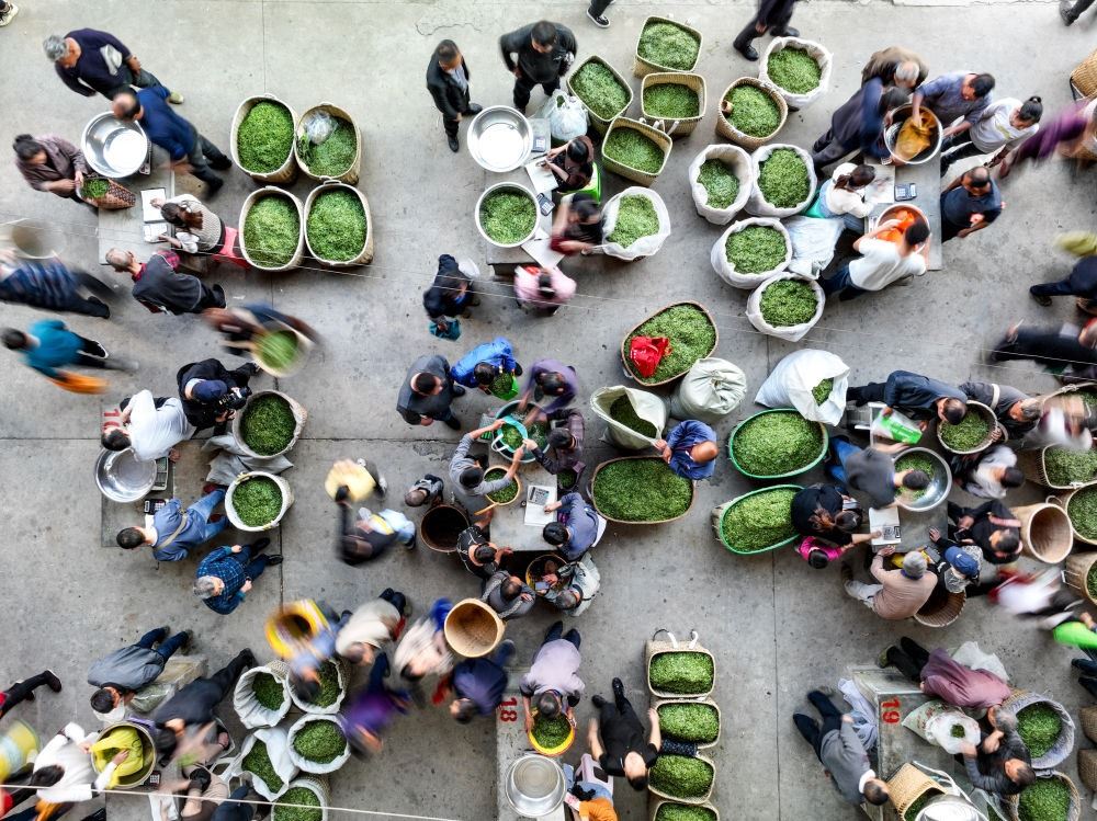 茶商在貴州省遵義市湄潭縣湄江茶青交易市場(chǎng)內(nèi)收購(gòu)茶青(無(wú)人機(jī)照片,2023年4月4日攝)。新華社記者 歐東衢 攝