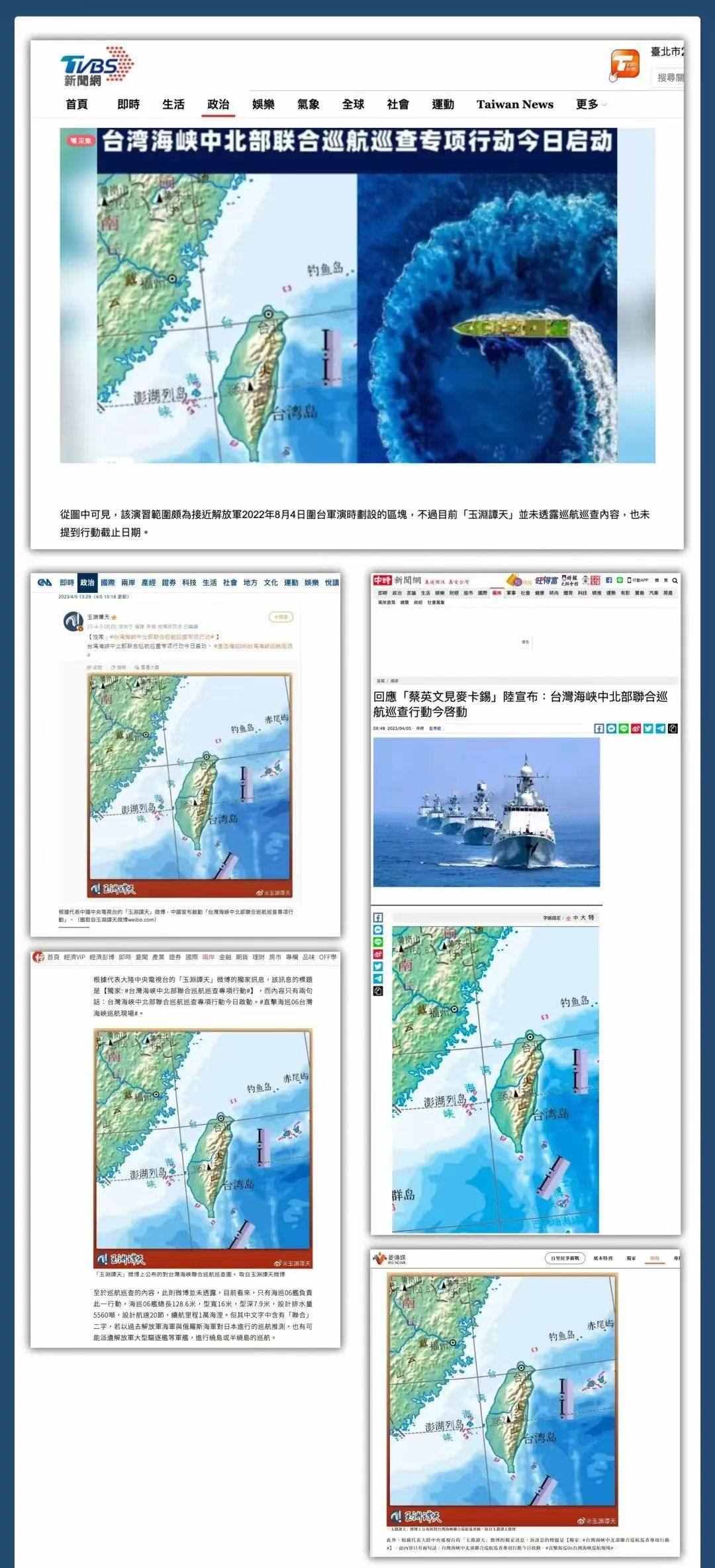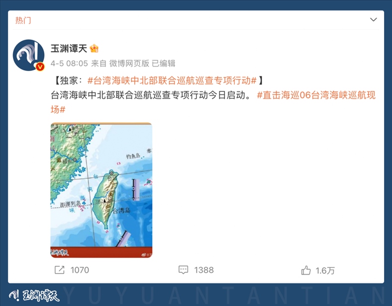 多家主流媒體轉(zhuǎn)發(fā)引用,消息瞬間傳遍全網(wǎng)。90余家臺(tái)灣媒體多平臺(tái)轉(zhuǎn)發(fā),揣測(cè)此次巡航活動(dòng)及玉淵譚天配圖釋放的信號(hào)。臺(tái)當(dāng)局就此消息進(jìn)行緊急回應(yīng),美國(guó)之音也撰文評(píng)論。